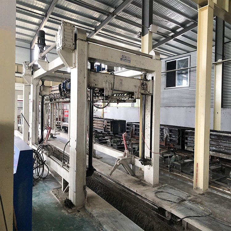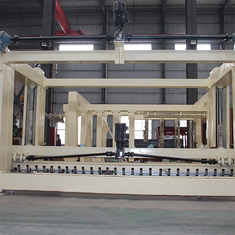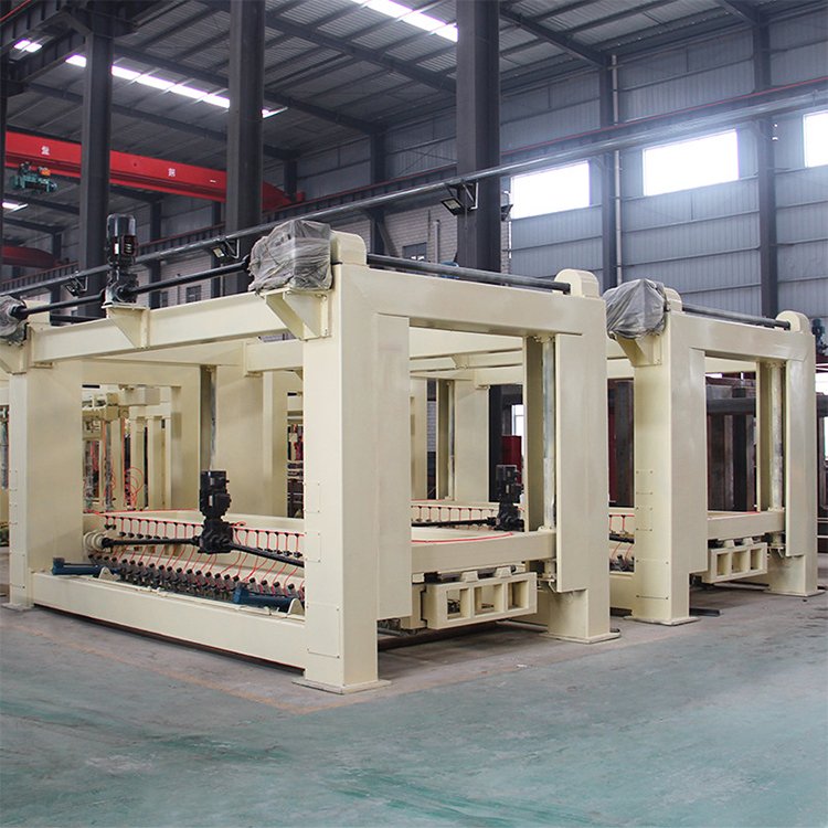 4、加氣塊初養(yǎng)和切割 澆注后模具用輸送鏈推入初養(yǎng)室進(jìn)行發(fā)氣初凝,室溫為50~70℃,初養(yǎng)時(shí)間為1.5-2小時(shí)(根據(jù)地理有利條件,可免去此工藝),初養(yǎng)后用負(fù)壓吊具將模框及坯體一同吊到預(yù)先放好釜底板的切割臺(tái)上.脫去???切割機(jī)即對(duì)坯體進(jìn)行橫切、縱切、銑面包頭,模框吊回到運(yùn)模車上人工清理和除油,然后吊到模車上組模進(jìn)行下一次澆注,切好后的坯體連同釜底板用天車吊到釜車上碼放兩層,層間有四個(gè)支撐,若干個(gè)釜車編為一組。切割時(shí)產(chǎn)生的坯體邊角廢料,經(jīng)螺旋輸送機(jī)送到切割機(jī)旁的廢漿攪袢機(jī)中,加水制成廢料漿,待配料時(shí)使用。