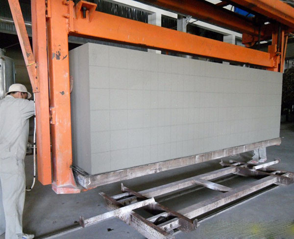 切好后將坯體用移動機連同底板移至蒸養(yǎng)小車。然后編入蒸壓釜中。