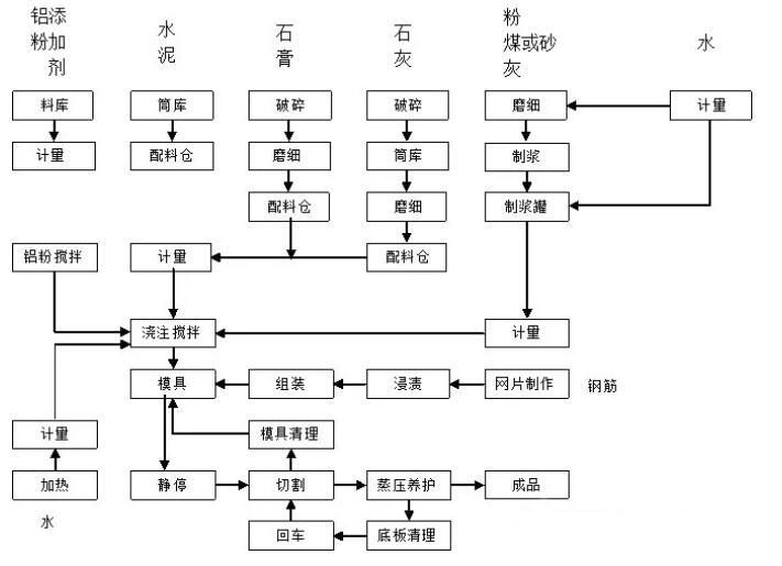 根據(jù)主原料不同,正一機(jī)械公司可設(shè)計(jì)年產(chǎn)5-30萬立方粉煤灰加氣塊生產(chǎn)線和砂加氣塊生產(chǎn)線,下面以粉煤灰或砂加氣磚砌塊生產(chǎn)線為例,簡述其生產(chǎn)流程。
