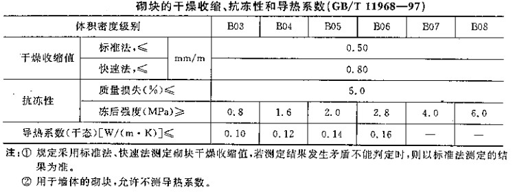 蒸壓加氣混凝土的抗凍性、收縮性和導(dǎo)熱性應(yīng)符合下表的規(guī)定。
