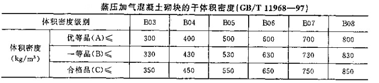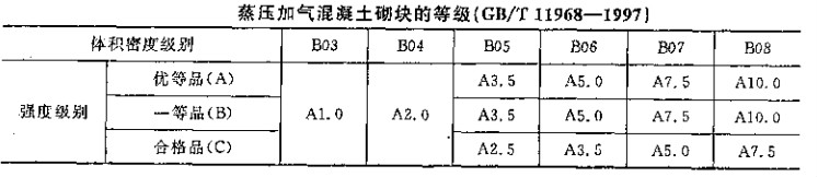按砌塊的干體積密度,劃分為:B03,B04,B05,B06,B07,B08六個等級。各級別的密度值應(yīng)符合下表的規(guī)定