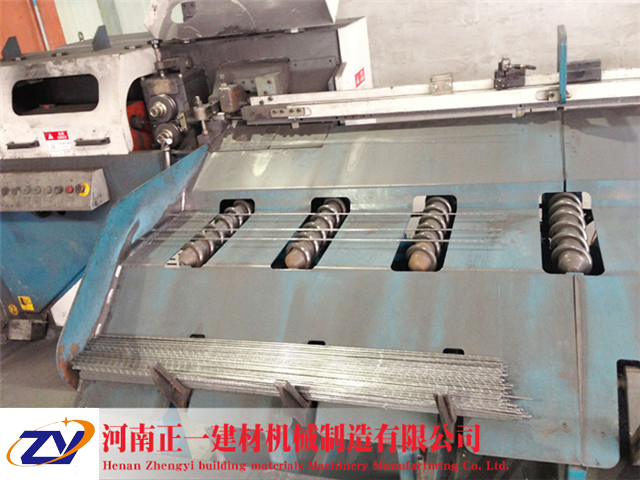 在微電腦控制器上輸入剪切鋼筋數(shù)量,根據(jù)鋼筋的剪切長(zhǎng)度設(shè)定好長(zhǎng)度控制觸片在脫料槽板上的安裝位置,由電動(dòng)機(jī)帶動(dòng)內(nèi)設(shè)有調(diào)直小輪的調(diào)直框作高速旋轉(zhuǎn),高速旋轉(zhuǎn)的調(diào)直框內(nèi)的調(diào)直小輪成螺旋狀擠壓卷曲的鋼筋,使鋼筋被壓直并不斷向前拉伸,實(shí)現(xiàn)鋼筋調(diào)直。同時(shí),當(dāng)被調(diào)直的鋼筋被拉伸到設(shè)定的長(zhǎng)度時(shí),碰觸到預(yù)先設(shè)定長(zhǎng)度距離的長(zhǎng)度控制觸片,并接通微電腦控制器的自動(dòng)切斷控制電路,通過(guò)電磁鐵拉動(dòng)控制鋼筋自動(dòng)切斷機(jī)構(gòu)和自動(dòng)脫料機(jī)構(gòu),實(shí)現(xiàn)鋼筋同步自動(dòng)切斷和脫料。