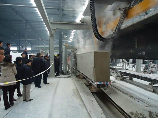 蒸養(yǎng)小車按序排列在入釜道軌上,由半成品吊具裝載切割后的坯體平放在小車上,再由入釜卷揚機進行編組,編組完畢后,由入釜卷揚機牽引進入蒸壓釜進行蒸壓養(yǎng)護。出釜時,再將小車組牽引至成品堆場,卸下成品,小車返回至入釜軌道,進行下一輪工作。