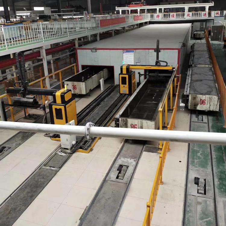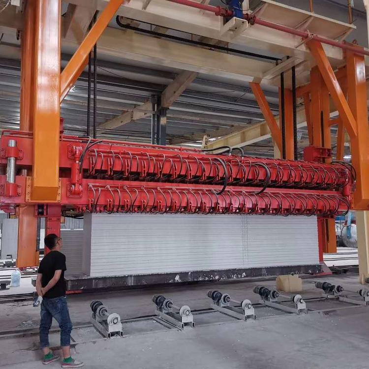 澆注后模具用輸送鏈推入初養(yǎng)室進(jìn)行發(fā)氣初凝,室溫為50~70℃,初養(yǎng)時(shí)間為1.5-2小時(shí)(根據(jù)地理有利條件,可免去此工藝),初養(yǎng)后用負(fù)壓吊具將??蚣芭黧w一同吊到預(yù)先放好釜底板的切割臺(tái)上.脫去???切割機(jī)即對(duì)坯體進(jìn)行橫切、縱切、銑面包頭,??虻趸氐竭\(yùn)模車上人工清理和除油,然后吊到模車上組模進(jìn)行下一次澆注,切好后的坯體連同釜底板用天車吊到釜車上碼放兩層,層間有四個(gè)支撐,若干個(gè)釜車編為一組.