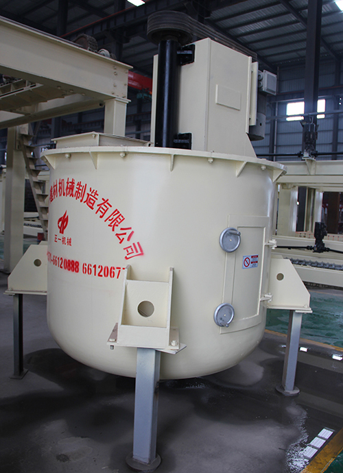 澆注工序是加氣混凝土區(qū)別于其它各種混凝土的獨特生產(chǎn)工序之一。澆注工序是把配料工序經(jīng)過計量及必要的調(diào)節(jié)后投入攪拌機(jī)的物料進(jìn)行攪拌,制成達(dá)到工藝規(guī)定的時間、溫度、稠度的料漿,通過攪拌機(jī)的澆注口澆注入模。料漿在模具中進(jìn)行一系列物理化學(xué)反應(yīng),產(chǎn)生氣泡,使料漿膨脹、稠化、硬化。澆注工序是能否良好氣孔結(jié)構(gòu)的重要工序,與配料工序一道構(gòu)成加氣混凝土生產(chǎn)工藝過程的核心環(huán)節(jié)。