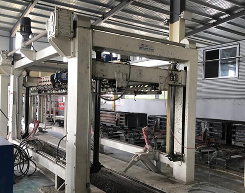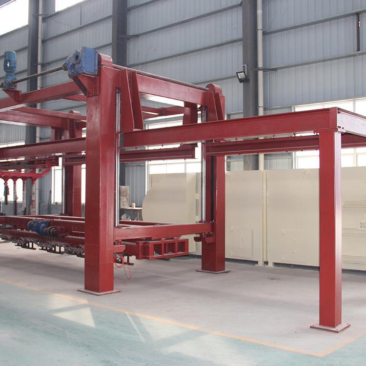 翻轉(zhuǎn)行車將坯體(帶???、側(cè)板)在空中翻轉(zhuǎn)90°,吊運(yùn)放置切割臺或切割小車上,脫模進(jìn)行切割。另外,將脫模模框與返回的側(cè)板組模,吊運(yùn)至澆注回車線上進(jìn)行循環(huán)澆注。