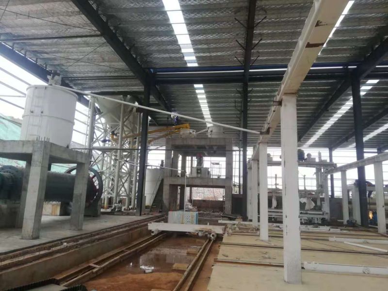 然后是澆筑坯體成型。干磨和濕磨分別將干料和濕料破碎后,再分別進(jìn)入球磨機(jī)進(jìn)行粉碎。.水泥、石灰、石膏.以及沙漿通過(guò)螺旋輸送機(jī)和管道進(jìn)入計(jì)量稱稱量,水泥、石灰、石膏、沙漿稱量后匯入澆注攪拌機(jī),鋁粉通過(guò)鋁粉攪拌機(jī)攪拌后注入澆注攪拌機(jī),經(jīng)過(guò)約5分鐘的攪拌后,料漿被注入模具內(nèi),占模具體積的1/2。在模具中,其中料漿的注入由PLC控制。澆筑后模具中的料漿有氣泡,需要用氣泡處理機(jī)震碎氣泡。隨后用插釬機(jī)插入網(wǎng)籠。(澆注樓有兩個(gè)稱,分別是干料稱和濕料稱,干料稱有刀絞,濕料稱有閥)