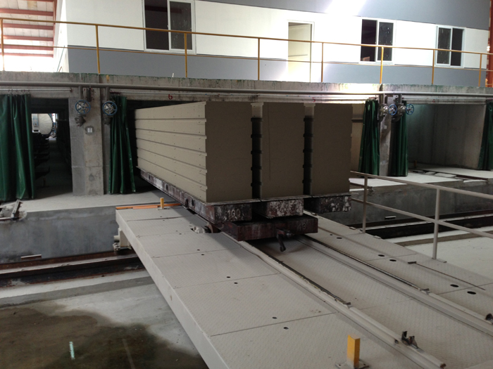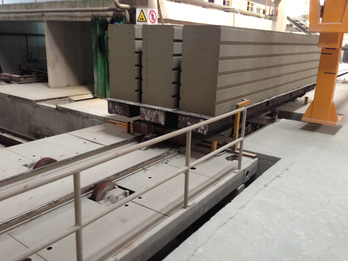 加氣混凝土設備專用擺渡車作用是將切割好的胚體換向拖動到蒸養(yǎng)工段,起到一個中間連接過度的作用。