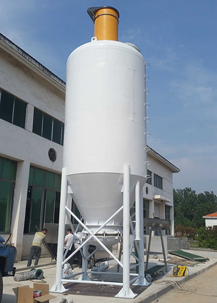 一般石灰罐車來了以后,把罐車上的膠皮軟管和料倉上的進(jìn)料管連接起來,打開電控柜,點(diǎn)擊控制面板上的震動(dòng)器開關(guān),這時(shí)倉頂除塵會(huì)間接啟動(dòng)。然后打開罐車上的出料閥門,這時(shí)罐車?yán)锏氖曳蹠?huì)由罐車產(chǎn)生的壓縮空氣隨著進(jìn)料管吹到料倉頂部,石灰粉由于自身重力下落到料倉底部。罐車產(chǎn)生的壓縮空氣和石灰粉進(jìn)到料倉的同時(shí),料倉里的多余空氣由倉頂除塵器排出,除塵器內(nèi)裝有空氣過濾器,空氣中的石灰粉會(huì)附著在濾芯上,保證排出的氣體的清潔度。濾芯上部裝有震動(dòng)電機(jī),震動(dòng)電機(jī)工作時(shí),附著在濾芯上的石灰粉會(huì)被震落下來。在料倉的頂部還裝有壓力安全閥,當(dāng)料倉里的壓力達(dá)到一定數(shù)值時(shí),安全閥會(huì)自動(dòng)開啟,空氣壓力自動(dòng)卸載,保證進(jìn)料時(shí)不會(huì)因?yàn)閴毫^大,而打壞料倉。