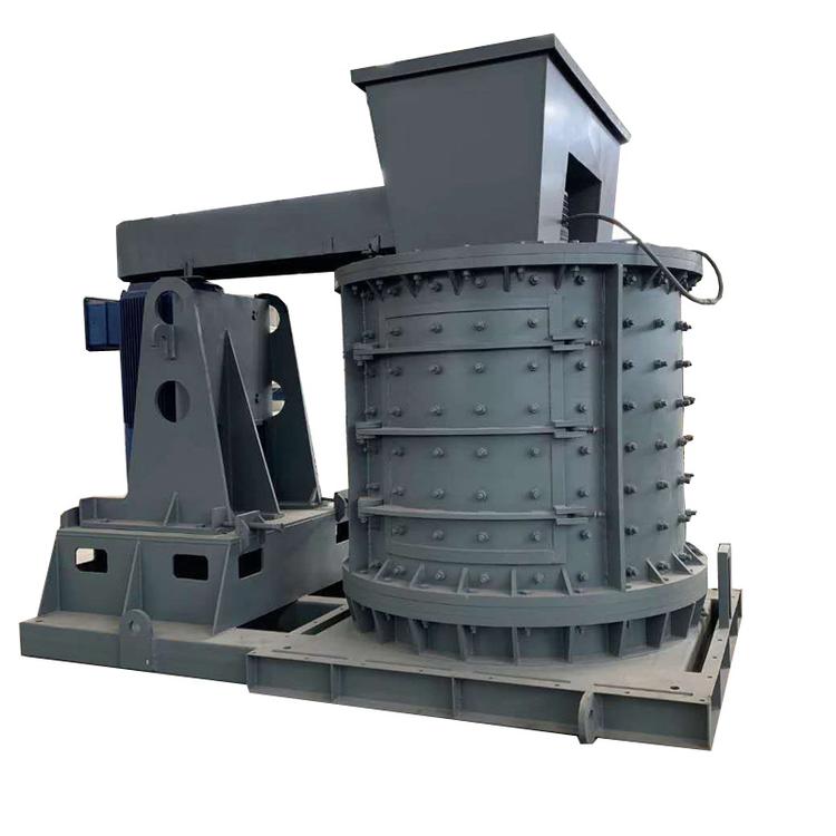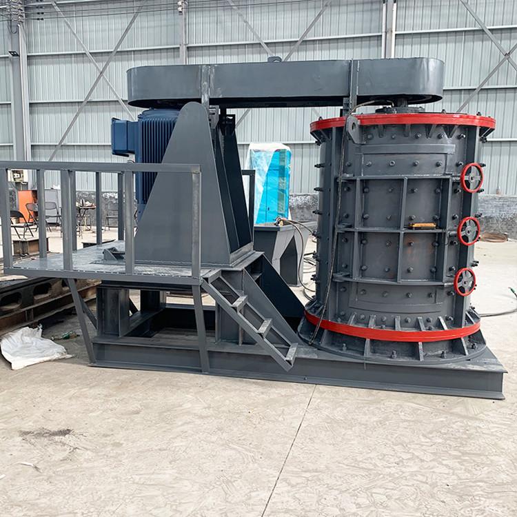 物料由復(fù)合破上部垂直落入高速旋轉(zhuǎn)的葉輪內(nèi),在高速離心力的作用下,與另一部分以傘狀形式分流在葉輪四周的物料產(chǎn)生高速撞擊與粉碎,物料在互相撞擊后,又會在葉輪和機(jī)殼之間以物料形成渦流多次的互相撞擊、摩擦而粉碎,從下部直通排出,形成閉路多次循環(huán),由篩分設(shè)備控制達(dá)到所要求的成品粒度。
