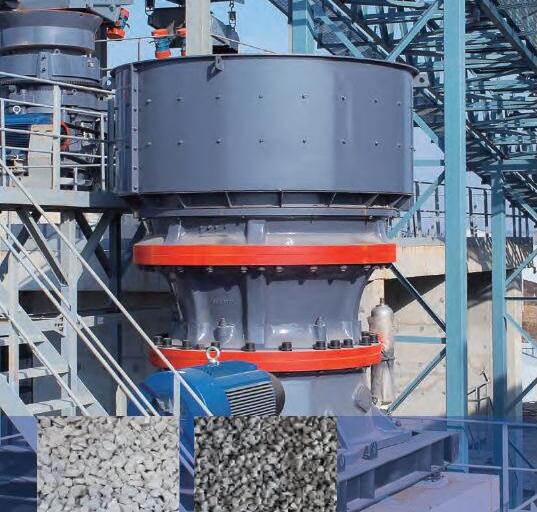 3、 層壓破碎、成品粒形優(yōu)異——通過采用粒間層壓原理設(shè)計的特殊破碎腔及與之相匹配的轉(zhuǎn)速,取代傳統(tǒng)的單顆粒破碎原理,實現(xiàn)對物料的選擇性破碎,顯著提高了產(chǎn)品細(xì)料比例和立方體含量,極大程度上減少了針片狀物料。