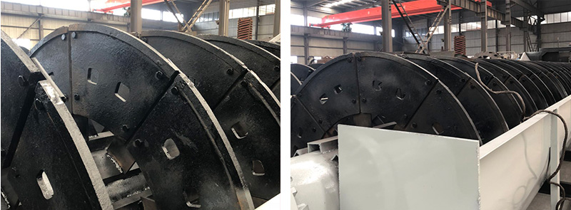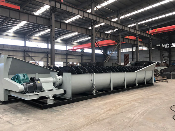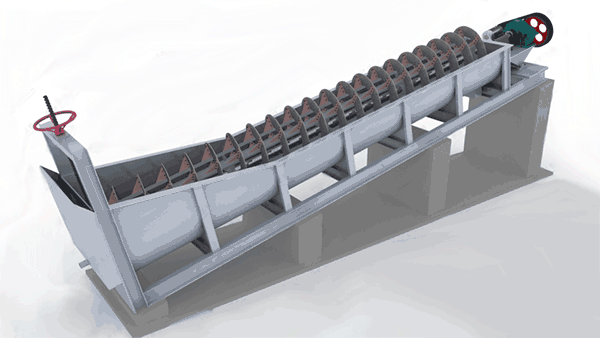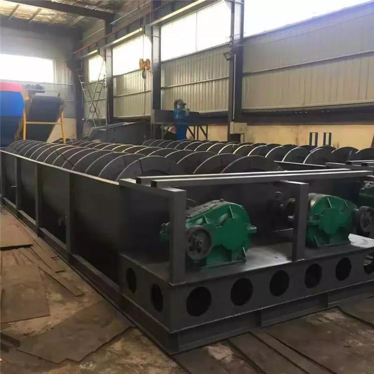 螺旋洗砂機(螺旋洗沙機)與輪斗洗砂機結(jié)構(gòu)不同,螺旋洗砂機的主要工作部件為螺旋葉片;兩者工作原理也不同,螺旋洗砂機是通過螺旋部件的旋轉(zhuǎn),使砂料得到不斷的翻攪的一種新型洗砂設(shè)備。物料由給料箱均勻給入,連續(xù)給主槽體中注入一定量的水,傳動部帶動螺旋軸以一定的速度旋轉(zhuǎn),迫使物料在槽體中翻轉(zhuǎn)滾動并向排料口運動,細(xì)粒級物料和雜質(zhì)隨溢流水經(jīng)溢流堰排出,粗粒度物料由排料口排出,從而實現(xiàn)物料的洗選、分級、除雜和脫水。